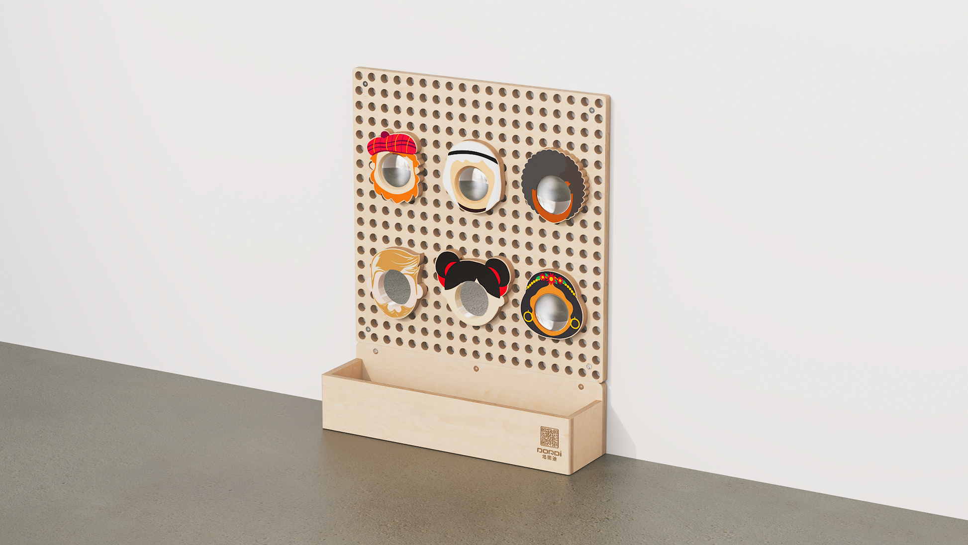 This product features various flat, convex, and concave mirrors mounted on a wall, with the mirror edges adorned with decorative figurines representing different ethnicities—European, Arab, African, Indian, Irish, and Chinese dolls. When children approach the different mirrors, they will see either their own reflection or the faces of the figurines, creating a playful and engaging experience. This interactive design encourages children to explore the principles of mirror imaging, sparking their curiosity and fostering an early interest in scientific discovery.