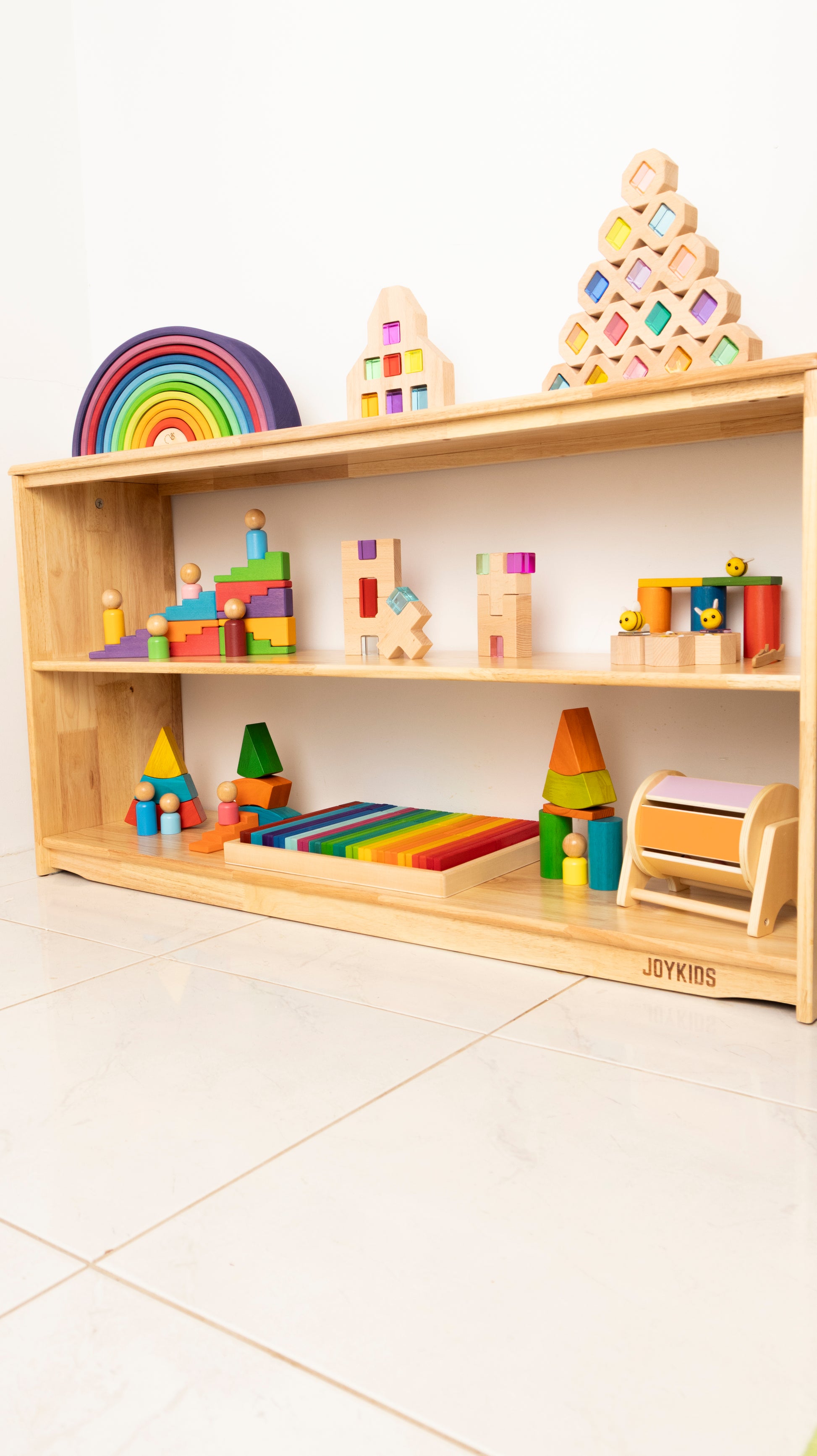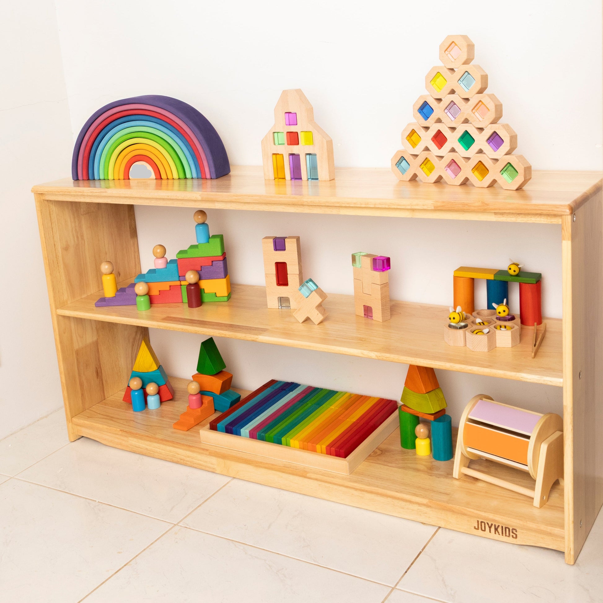 We have the three tier open and toy shelf and it is perfect height for my three little children. It is beautiful quality and nice and strong. We have a few other joy kids pieces and they all just tight together so beautifully.